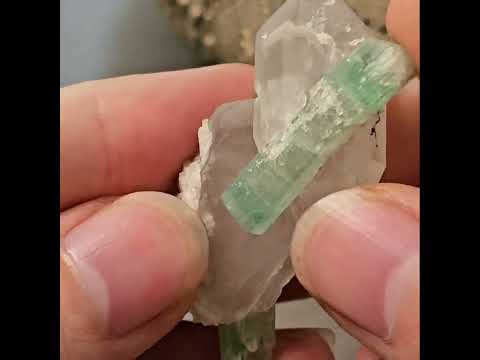 This little guy pretty much jumped into our hands as soon as we saw him. Electric, blue green tourmaline intersects with two double terminated quartz points that grew into each other. The largest of the tourmaline crystals has a really charming area of healed growth, visible as a slightly milky patch and a subtle but clearly visible change of direction along the C-axis of the crystal.