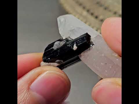 This little guy has quite a story to tell, with a glassy and lustrous piece of black tourmaline intersecting a piece of milky quartz that self-healed itself into a double terminated crystal. The tourmaline also has two of the cutest little baby quartz points poking their heads out, and the overall shape and feel of this piece is oddly sapphire-like.