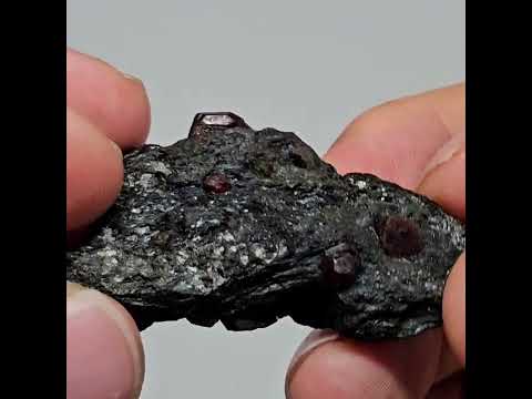 This is an awfully giggly little crystal for as dark and mysterious as it's trying to be. Several rich, red, and glassy little almandine garnet crystals sit nestled into a rich biotite (Mica's iron, potassium, and manganese rich cousin) matrix, making this piece feel beautifully lunar.