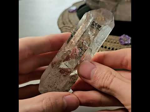 The combination of water clear quartz, pale smoky color, cathedral texturing, a completely self-healed base, and a light dusting of mossy chlorite had our hearts all aflutter as soon as we held this crystal. Tiny but brilliant rainbows speckle the inside of this piece, and a geometrically recessed area in the cathedral texture is a perfect nest for your thumb.