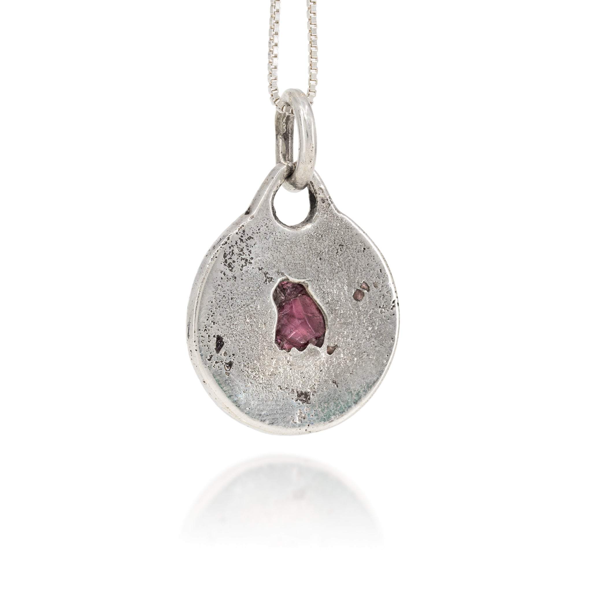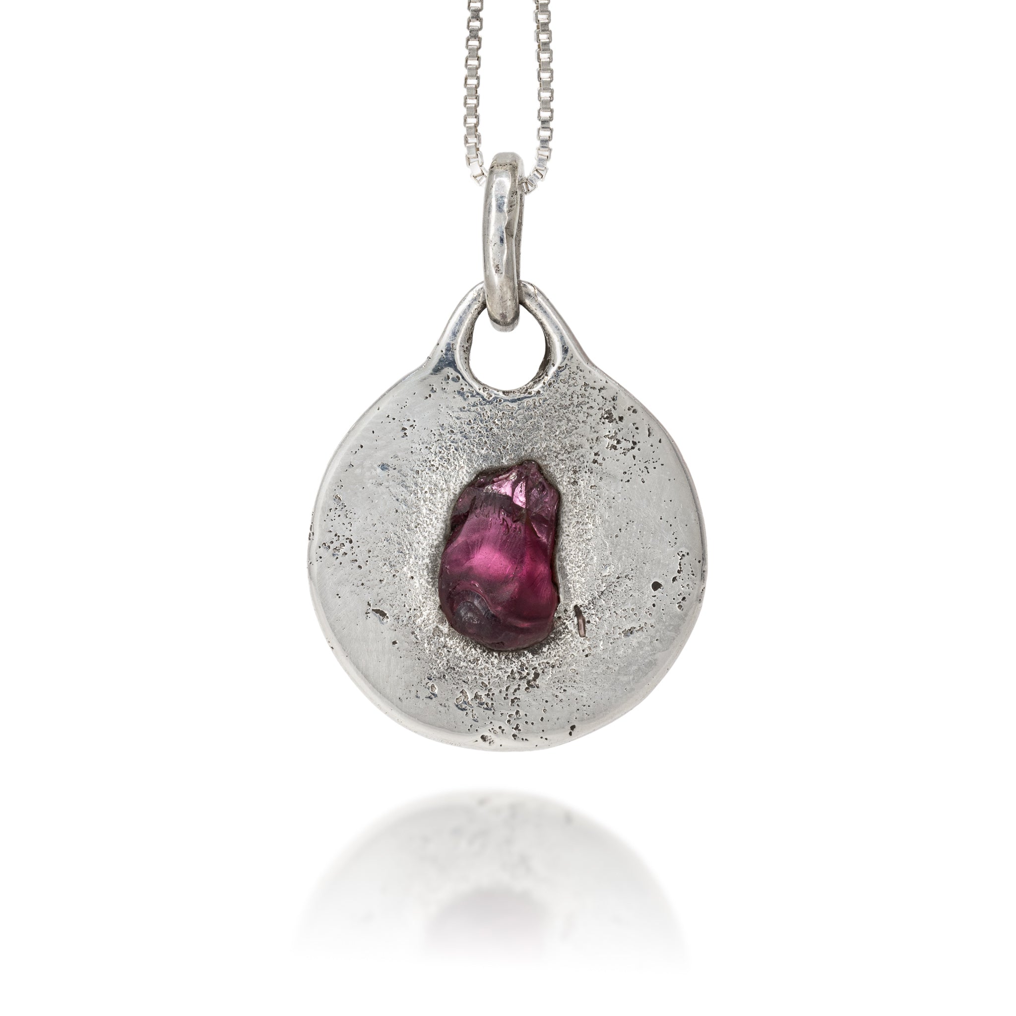 Set with a single deep garnet cast directly into molten silver, this pendant captures the stone’s rich purple-red glow and the organic texture left by the sand casting process. The metal’s subtly grained surface contrasts beautifully with the gem’s inner fire, creating a piece that feels both elemental and refined. Comes with an 18" sterling silver chain.