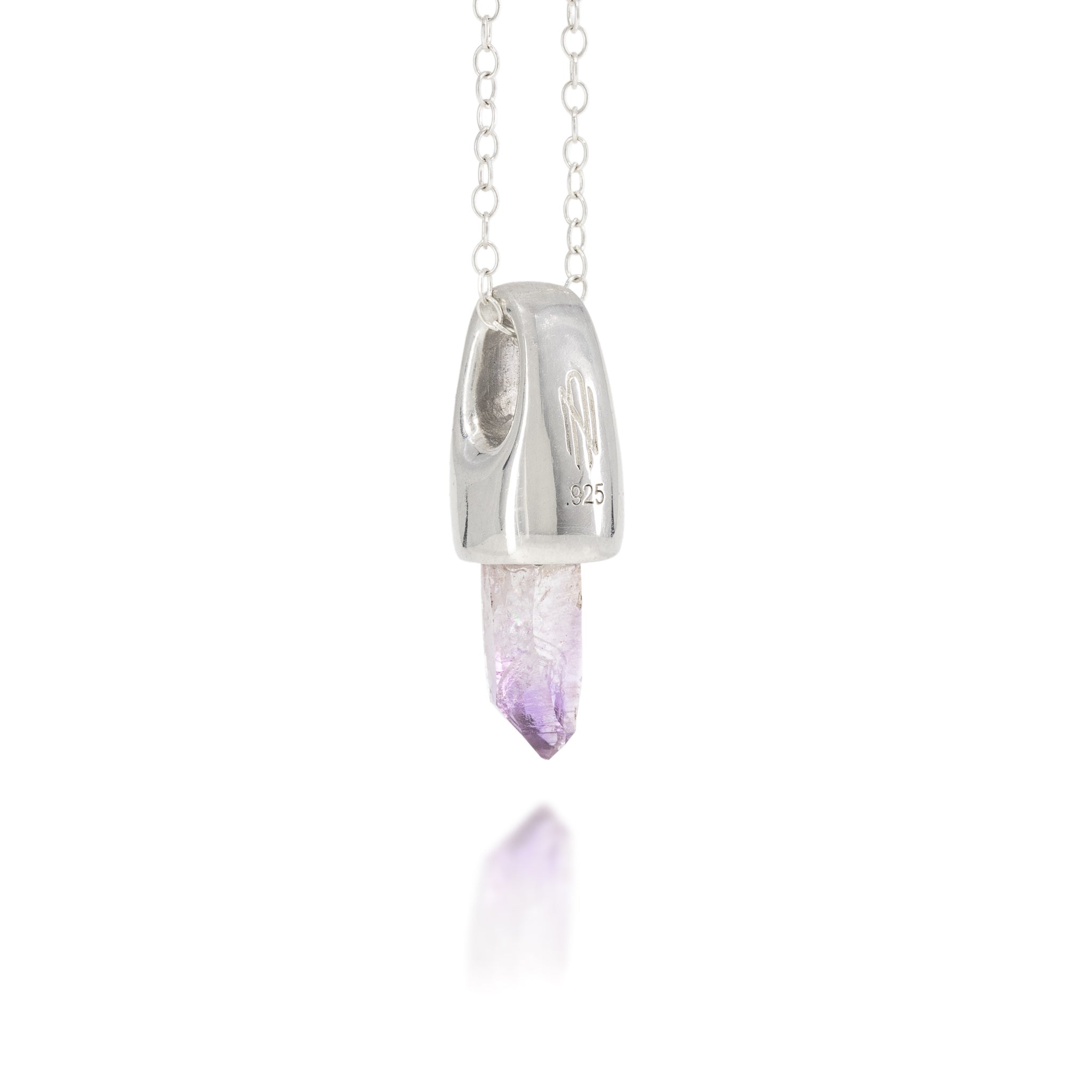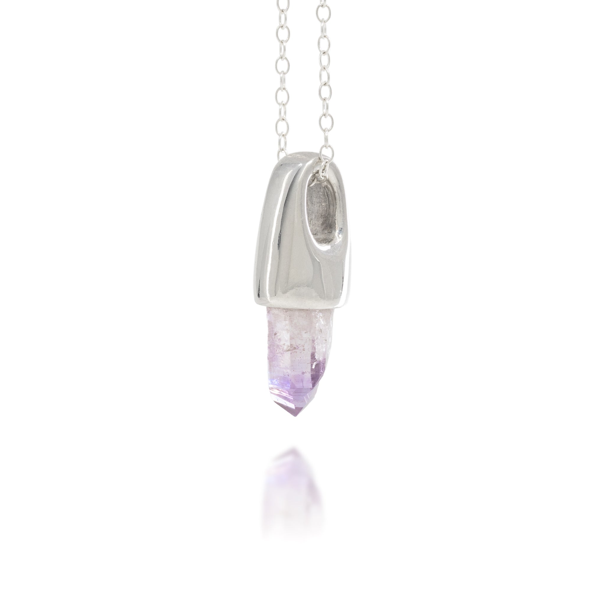 Set with a single natural amethyst crystal from Veracruz, Mexico, this pendant highlights the pale lavender hue and delicate structure characteristic of this locality. These crystals form in open cavities within volcanic rock, often growing as distinct, naturally terminated points on a light rhyolitic matrix. Comes with adjustable sterling silver chain that fastens at 16 and 18 inches.