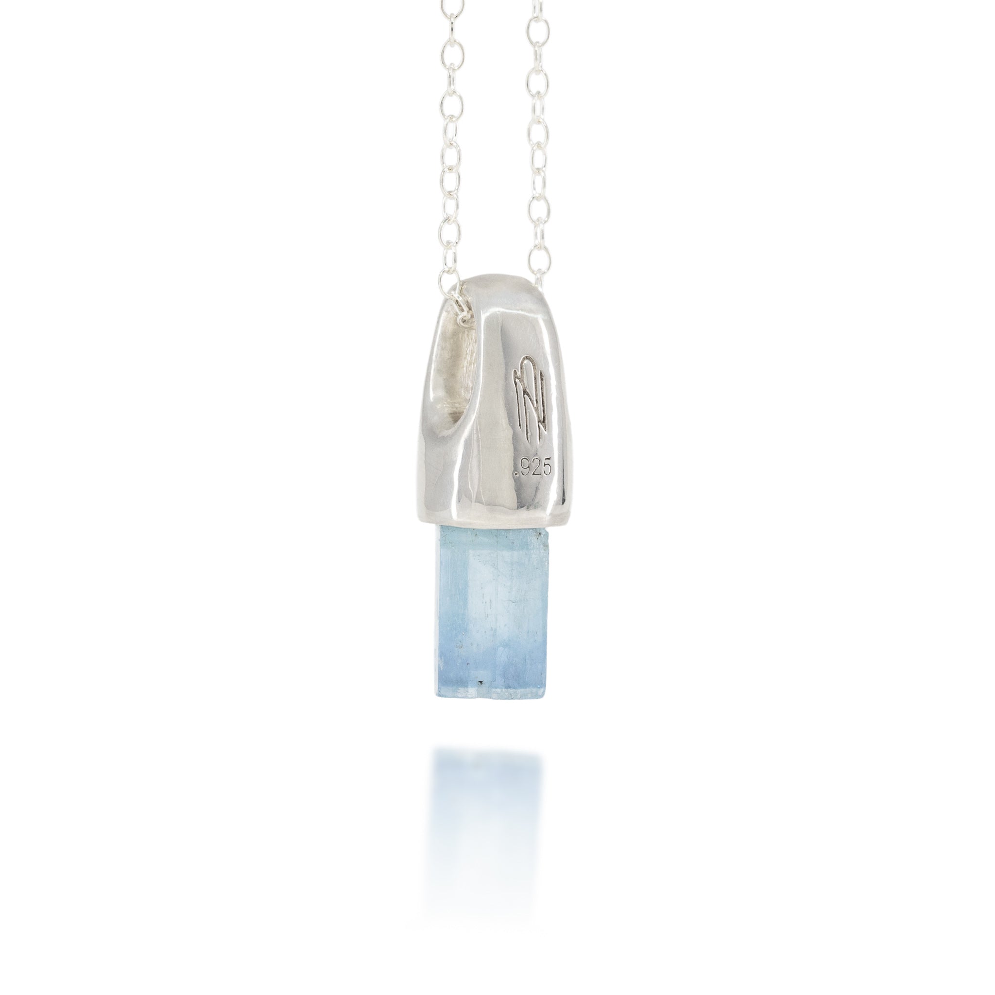 This aquamarine pendant features a single natural crystal with the cool, translucent blue that defines this gem. Subtle inclusions and natural facets catch the light in a soft shimmer, giving the piece a gentle, fluid presence. The crystal is set in sterling silver and paired with an adjustable chain that fastens at 16 and 18 inches.
