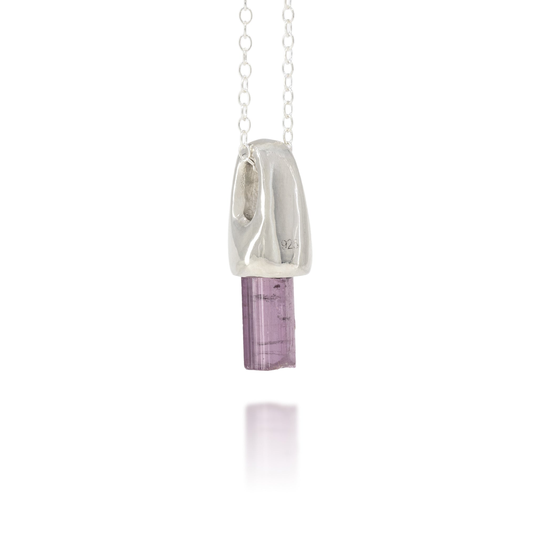 This purple tourmaline pendant features a natural crystal in a rich violet shade - a less common color within the tourmaline family. Set in sterling silver, it comes with an adjustable chain that fastens at 16 and 18 inches.